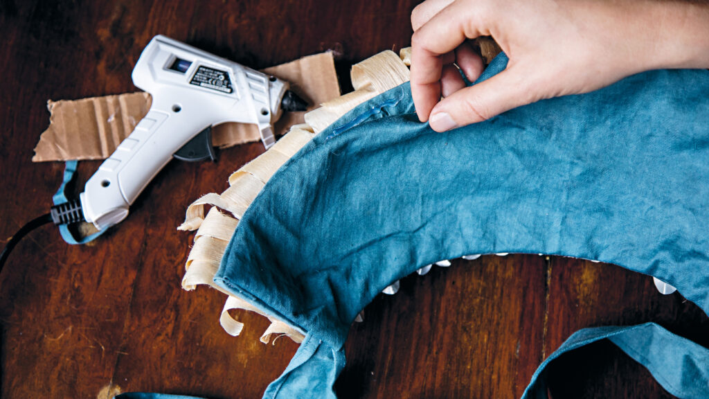 Finally I covered the back of the crown with fabric by placing it flat against the cardboard, adding a string of glue approximately 5cm (2in) from the edge of the base between the cardboard and the fabric, then pressing together the fabric and the glue. The aim with this step is to get the fabric flat against the inside of the base, while the last 5cm (2in) towards the edges are loose. The next step is to fold in the edges of the fabric, so that the folds sit evenly with the edge of the crown, then glue them down so that no raw or frayed fabric edges are visible.