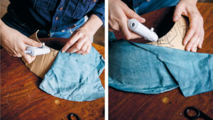 Start by drawing out the shape of the crown on the cardboard and cut it out. Take out the fabric you want to cover the crown with and use the cardboard as a template for cutting out two fabric pieces that are approximately 2cm (¾in) larger than the template on all sides.