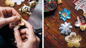 Cut out two paper templates in the shapes of a larger and a smaller flower. Draw the flower shapes on the metal with a biro and then cut them out. I folded the petals one by one with my thumbnail to give the flowers shape, then I punched a hole in the middle of each flower using a hammer and a nail. Make sure you hammer onto a non-delicate surface so you don’t get marks on your table; a chopping board works fine.