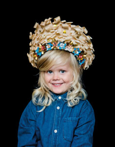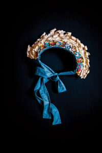 Simple elegance has its place, but sometimes you need a flashy crown to brighten up the mood. This piece is inspired by the traditional headwear called ‘lad’ that is a part of the folk costume of Malung. Such crowns are worn by brides for weddings, but my crown can be worn by anyone, anytime. The crown consists of a base made of corrugated cardboard that I have bent into shape, dressed in fabric and then decorated. Two tie bands at the neck keep it in place.